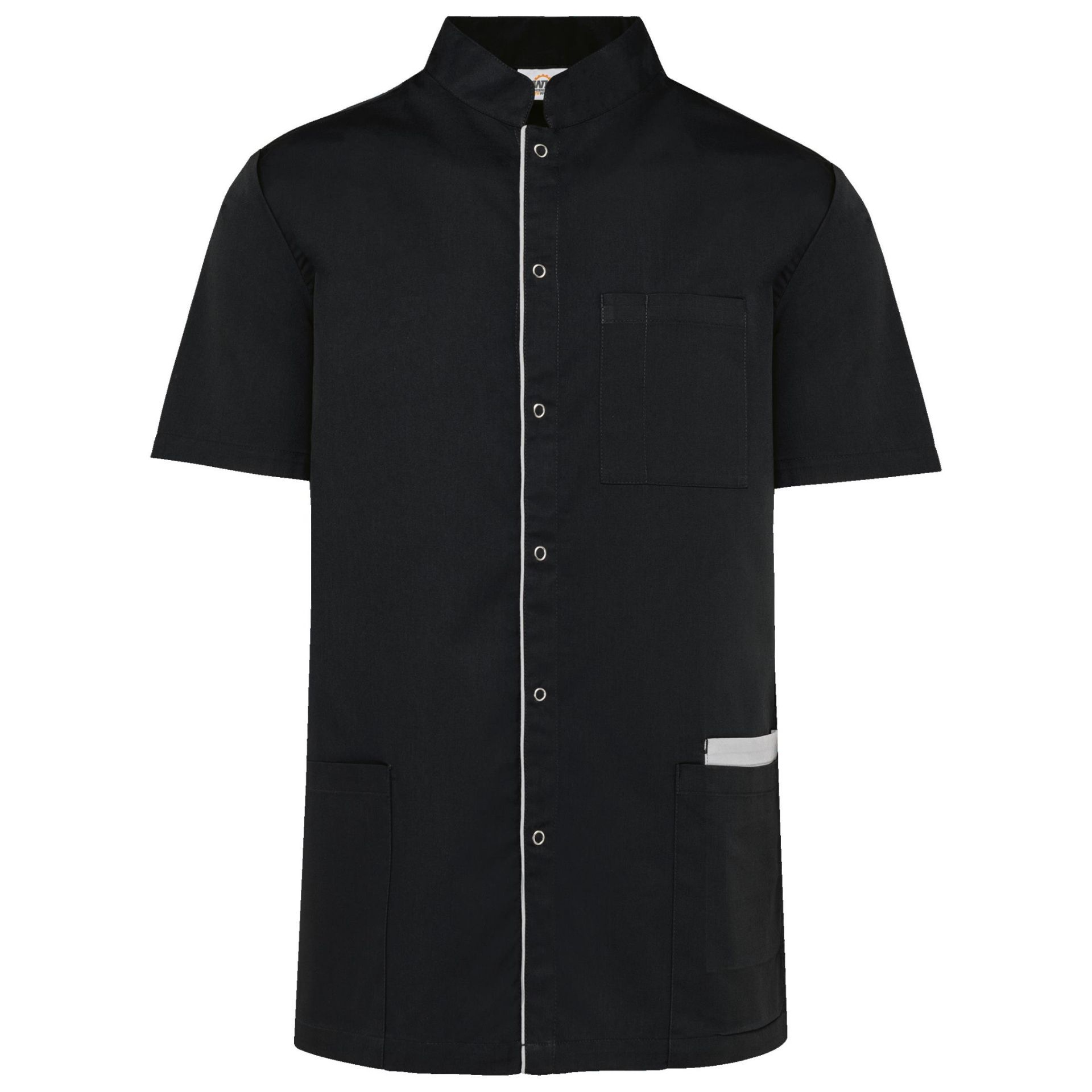 65% Polyester / 35 % Baumwolle. Twill aus Polyester-Baumwolle. Waschbar bei 60 °C. Gerader Schnitt. Mandarinkragen. Verschluss auf der Vorderseite mit Druckknöpfen. 1 aufgesetzte Brusttasche mit Stiftfach. 2 große aufgesetzte Taschen auf der Vorderseite, wobei eine (links) ein doppeltes Fach hat (Innenfach mit kontrasfarbenem Rand). Kontrastfarbene Paspel auf der Verschlussleiste und in der Rückenpasse. Namensetikett auf der Innenseite. 2 seitliche Gehschlitze. Markenetikett zum Abreißen.