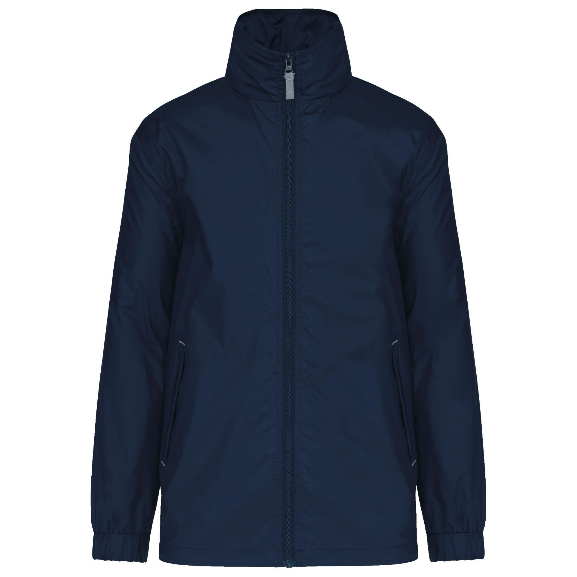 100% Polyamid 210 T mit Acrylbeschichtung. Durchgehender Reißverschluss. 2 Zipper-Taschen vorne mit kontrastierten Ziernähten. 1 Innentasche. Futter 100% Polyester: 3/4 Polyester und 1/4 Netz - wärmend aber luftig. Ärmelfutter 100% Polyester. Elastischer Kordelzug mit Stoppern am Bund. Kapuze im Kragen. Reißverschluss für leichtes Veredeln.