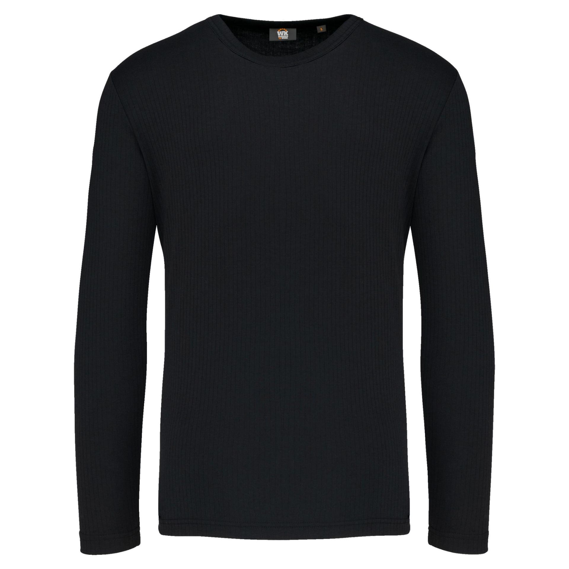 80% Polyester / 20% Viskose. Warmes Unterhemd. Rundhalsausschnitt. Doppelnaht an Ärmeln und Bund.