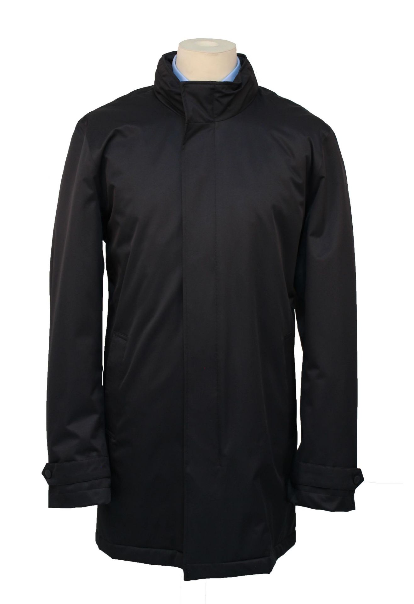 100 % Polyester, wasserbeständig (2000 mm). 5 Knöpfe mit Reißverschluss, wasserbeständig, Schlitz in der Mitte, 2 Taschen vorne, Steppfutter mit 2 Innenfächern, im Kragen verstaubare Kapuze. Maschinenwaschbar.