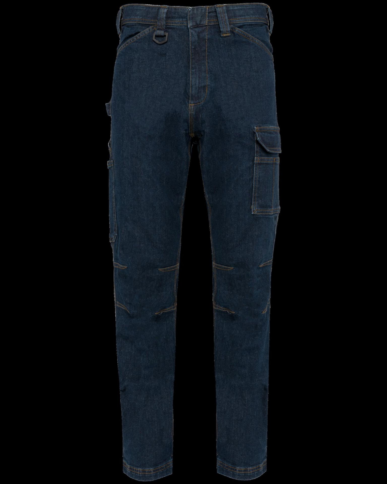 99 % Baumwolle / 1 % Elasthan. Denim-Stoff. Bei 60 °C waschbar. Körpernaher Schnitt. Knopfleiste mit verdecktem Knopf und Metallreißverschluss. Vorderseite: 2 Taschen mit Schrägbandöffnung. Linke Seite: Tasche mit verstärkter Naht und Klappe sowie Klettverschluss + Übertasche mit 3 Fächern, davon ein Stiftfach. Rechte Seite: Hammerfach, Tasche für Messband + Übertasche mit Klettverschluss. Rückseite: 2 aufgesetzte Taschen mit verstärkten Nähten, eine davon mit Klappe und Klettverschluss. Am Rücken abgerundeter Gürtel mit breitem elastischem Band auf der Innenseite mit Anti-Rutsch-Beschichtung für optimalen Halt. Orangefarbene Schnalle in der Rückenmitte auf der Innenseite. Schlaufen mit verstärkten Nähten, wobei jene in der Rückenmitte breiter ist, mit einem Kunststoffring auf der Vorderseite. Abnäher an den Knien für mehr Bewegungsfreiheit. Verstärkte Falte im Schritt für mehr Komfort und optimale Bewegungsfreiheit. Dreifache Ziernaht an Seiten, Schritt und Rücken. Doppelnähte am Beinabschluss. Markenetikett zum Abreißen.