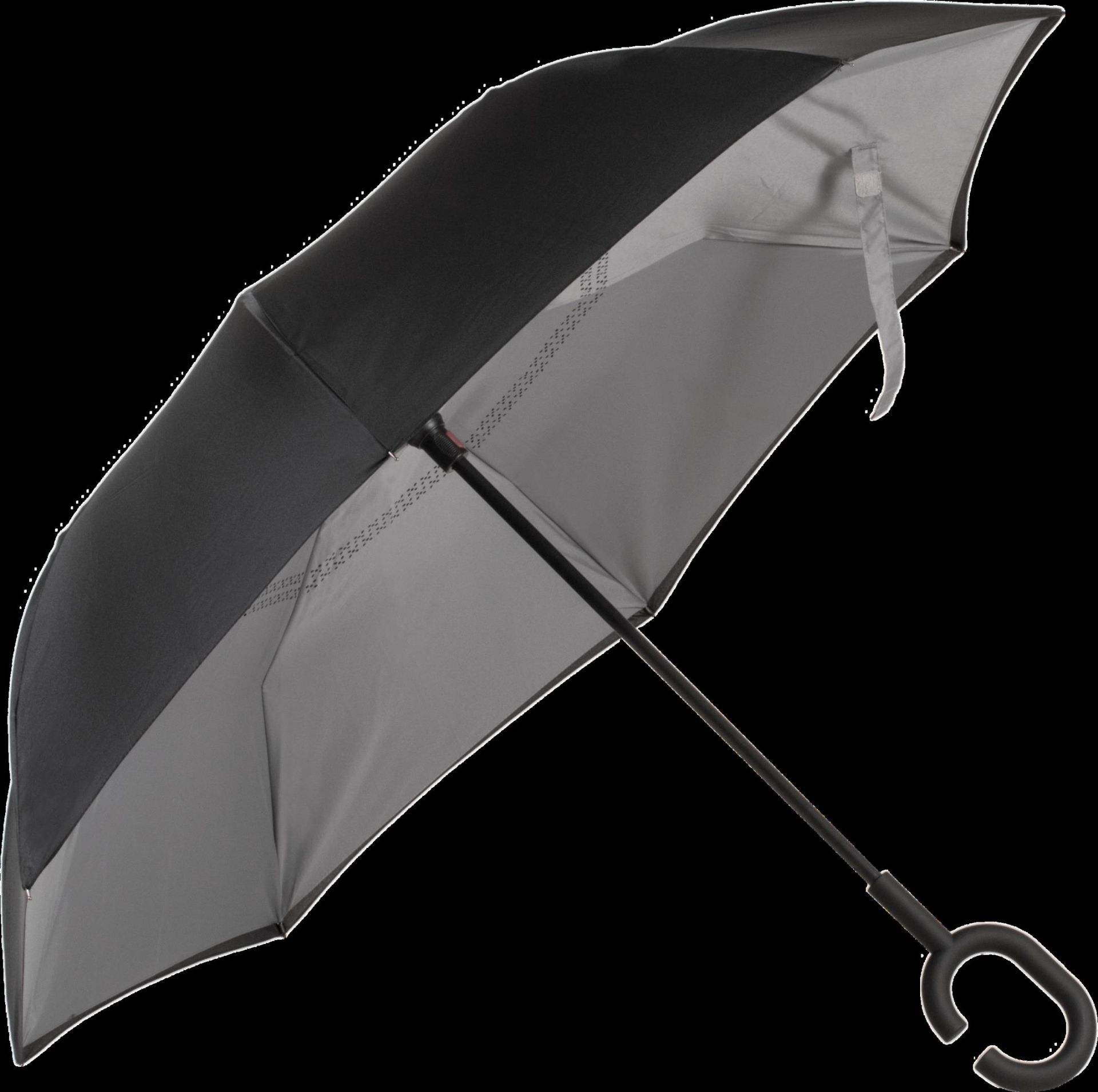 Regenschirm mit umgekehrter manueller Öffnung (58,5 cm), Metallstock, Glasfaserstreben und -spitzen, Polycarbonat-Griff in C-Form zum Einhängen am Handgelenk für freie Hände. Bezug aus 190T-Polyesterpongé.