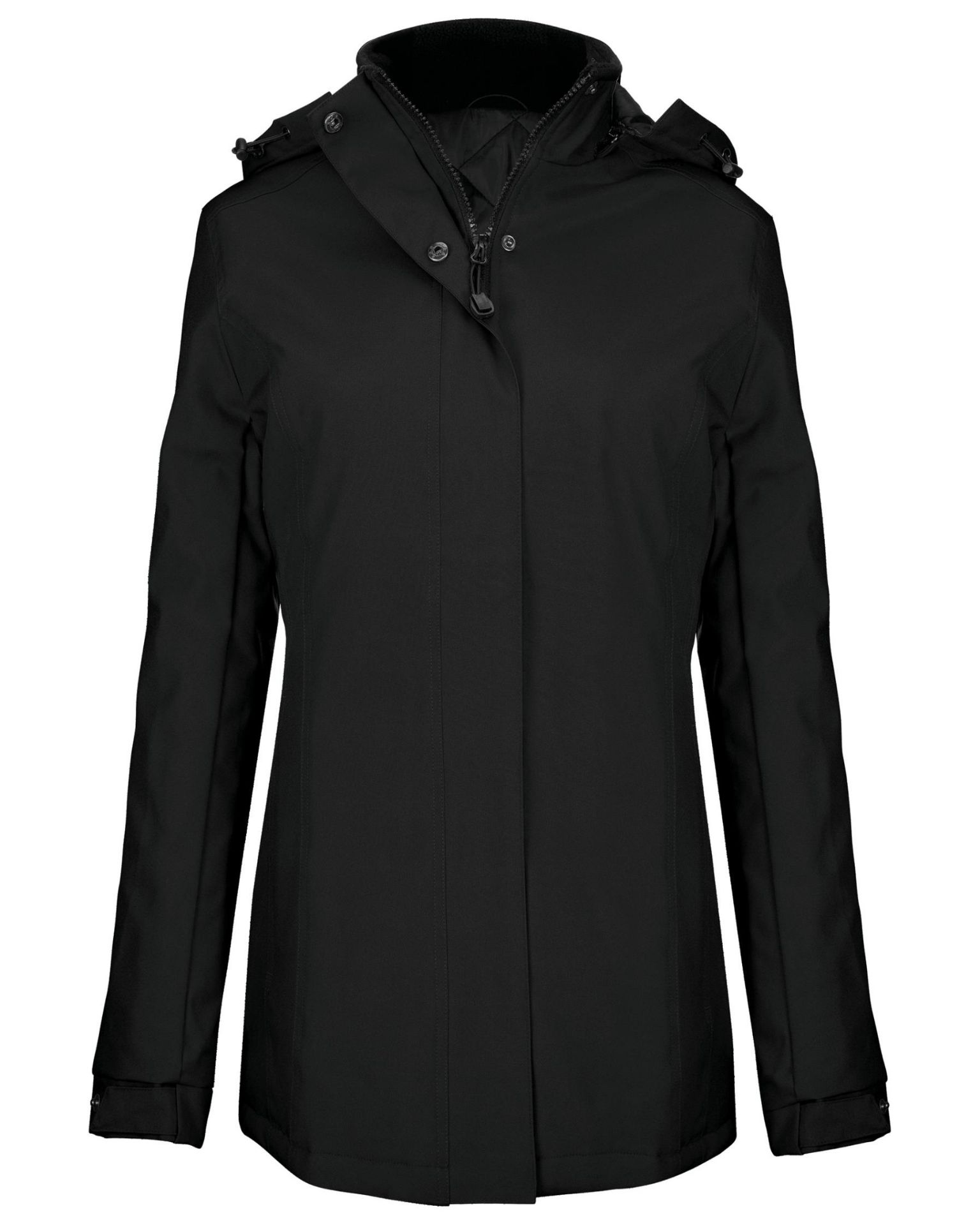 Außenseite: 100 % Oxford-Polyester. Innenseite: Polyester-Steppfutter. Reißverschluss mit Leiste und unsichtbaren Druckknöpfen. 2 Reißverschluss-Außentaschen. 1 Reißverschluss-Innentasche. Abnehmbare Kapuze. Kragen mit Fleecefutter. Reißverschluss für leichtes Veredeln.