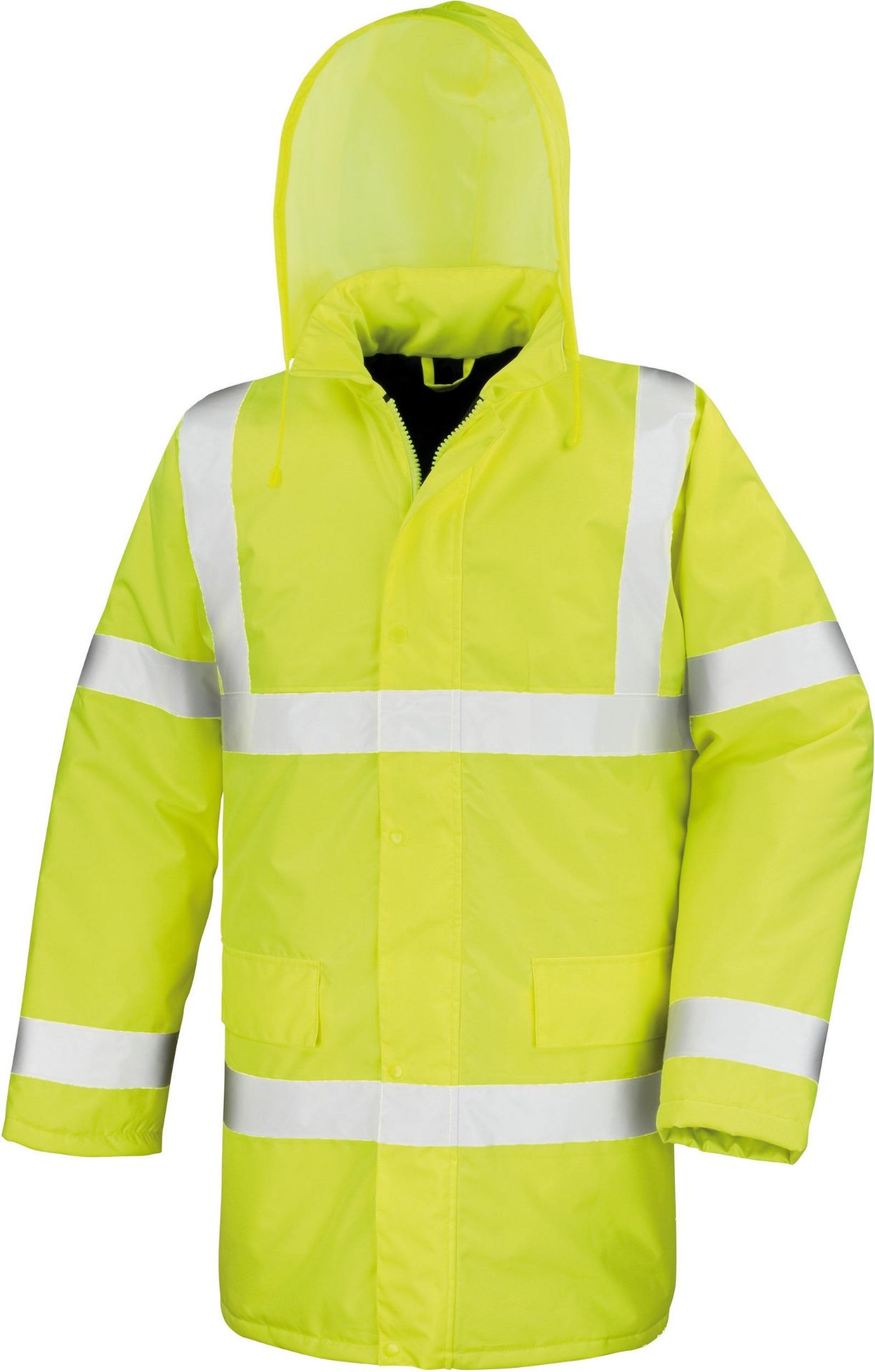 Außen: 300D Polyurethan beschichtetes Oxford Polyester, Innen: Polyester Wattierung, Futter: 190T Polyester. EN ISO 20471:2013 type 3, GO/RT 3279Issue 8:2013 Type 3 (nur Orange). Versiegelte Nähte. Verborgene Kapuze mit Kordelzug. Stabiler 2- Wege Reißverschluss vorne mit Windblende. Zwei große Außentaschen mit Druckknöpfen. Eine Innentasche. 50mm Reflektorstreifen. Für größtmögliche Sicherheit sollte dieses Kleidungsstück gut befestigt und in sauberem Zustand getragen werden.