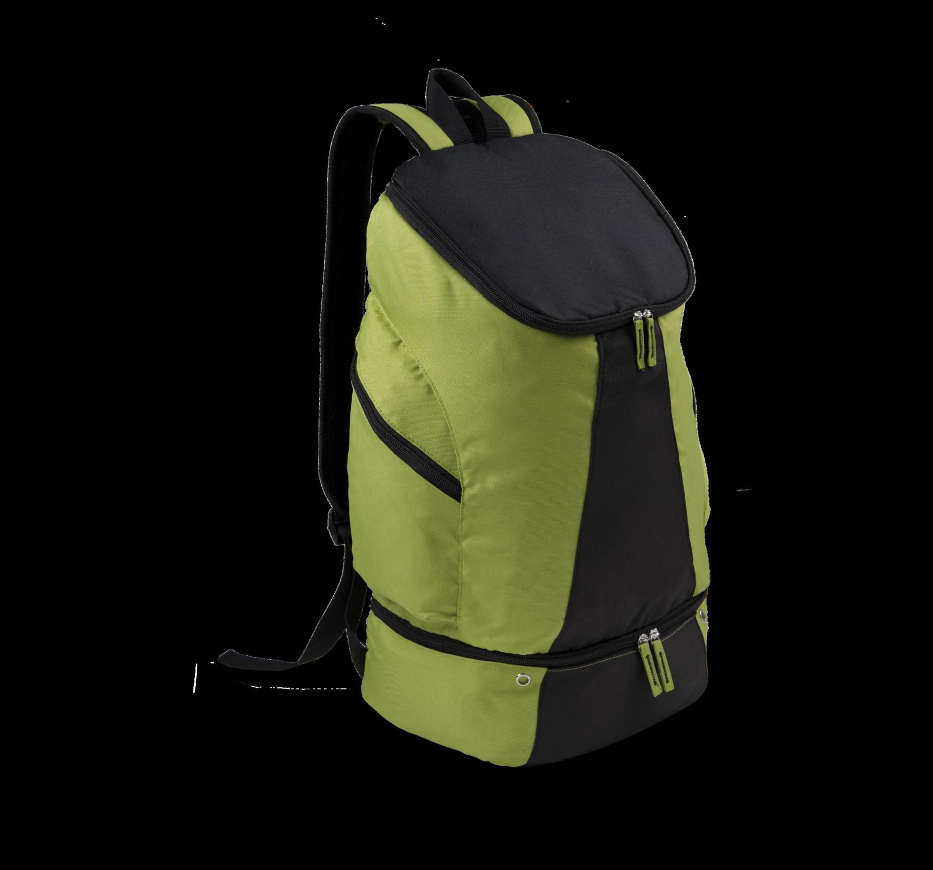 Sport-Rucksack aus 600 D Polyester + 300D Polyester Ripstop, geräumiges Hauptfach, separates Schuhfach mit Belüftungsösen, Seitentaschen, aufgepolsterter Rücken, ergonomische Schultergurte.