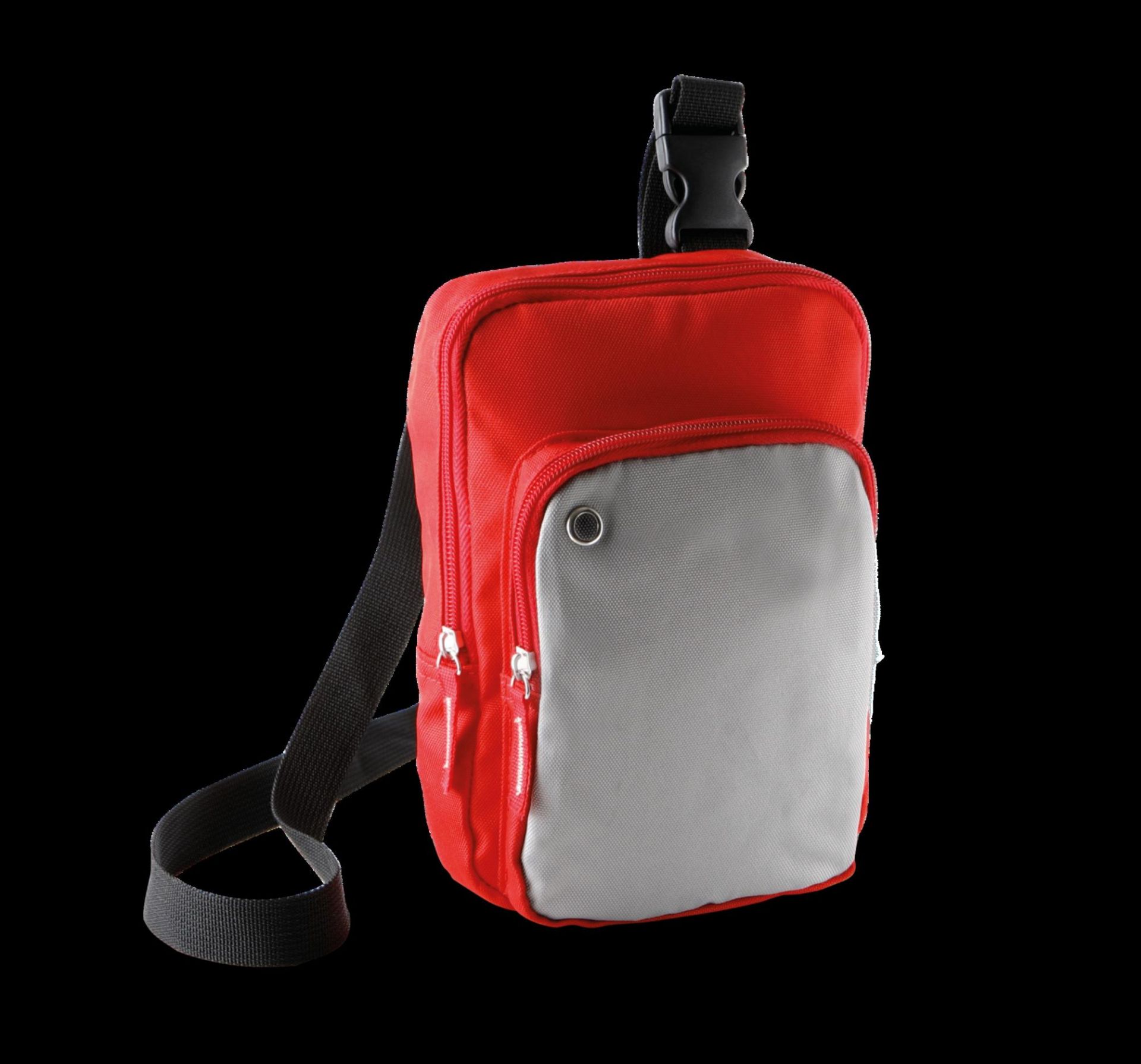 Umhängetasche aus 600D Polyester, Trageschlaufe in der Länge einstellbar, Hauptfach mit Schlüsselring, Einwege-Reißverschluss, Frontfach mit separatem Reißverschluss, weitere Tasche auf der Rückseite.