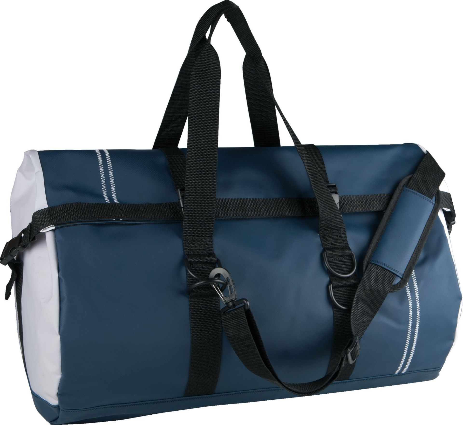 Durchgängig wasserfeste Persenning-Beuteltasche, Poly-Vinyl-Chlorid (PVC). Einrollverschlusssystem mit Schnallen, ideal am Meer oder bei Fahrten mit dem Motorrad.