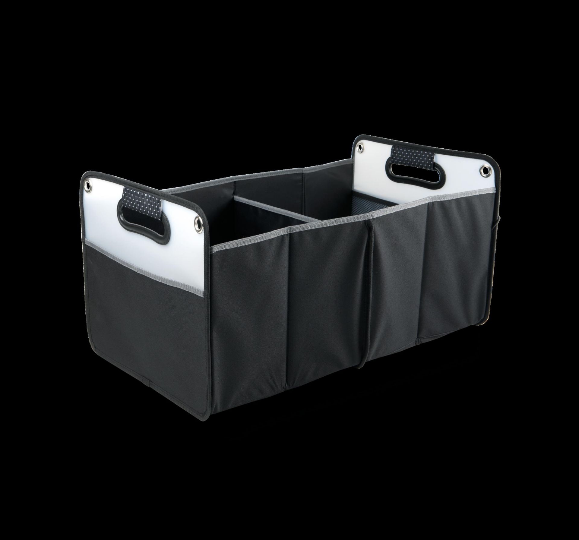 Cargo Korb aus 600D Polyester, zwei große zusammenfaltbare Körbe, Einsteckfach außen, Metallösen.