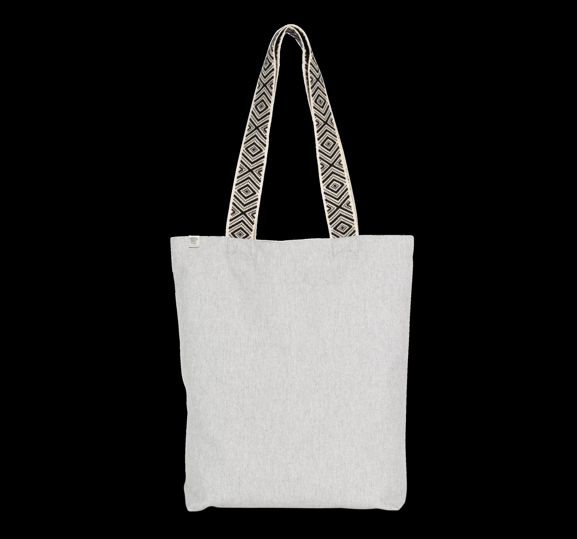 Recycelte Baumwolle / recycelter Polyester. 75 % recycelte Baumwolle / 22 % recycelter Polyester / 3 % andere Fasern (Pebble grey), 73 % recycelte Baumwolle / 25 % recycelter Polyester / 2 % andere Fasern (Ecume / Ethnic Blue), 67 % recycelte Baumwolle / 30 % recycelter Polyester / 3 % andere Fasern (Ecume / Ethnic Red). Die kontrastfarbenen Tragegriffe zeichnen sich durch ein Muster im ethnischen Stil aus und sind 60 cm lang und 4,25 cm breit für einen optimalen Komfort.