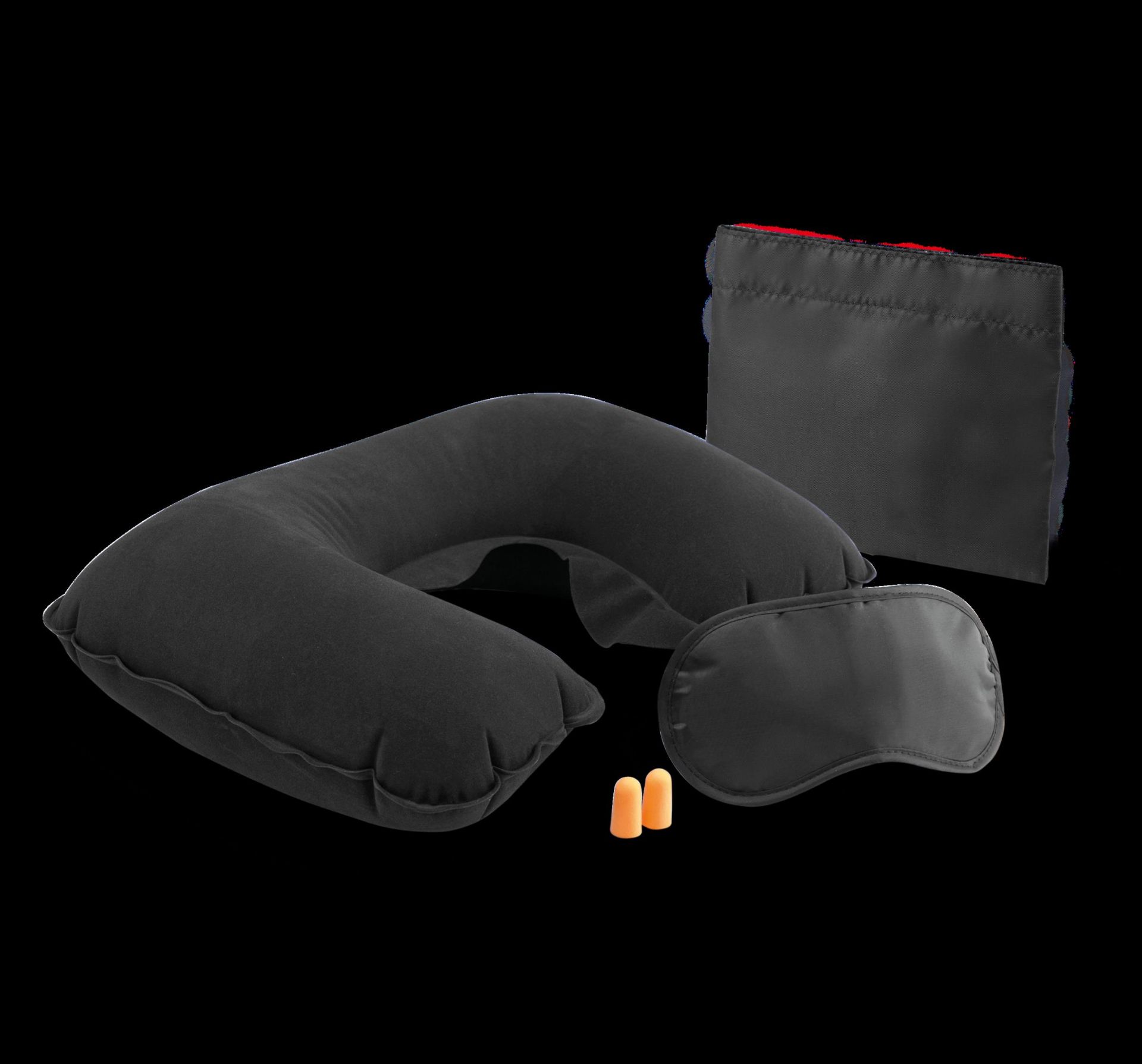 Bequemes Reise-Set. Mit 210D Polyester bedruckbarem Etui. Klettverschluss. Inklusive Ohrstöpsel, Augenmaske und aufblasbarem Nackenkissen.