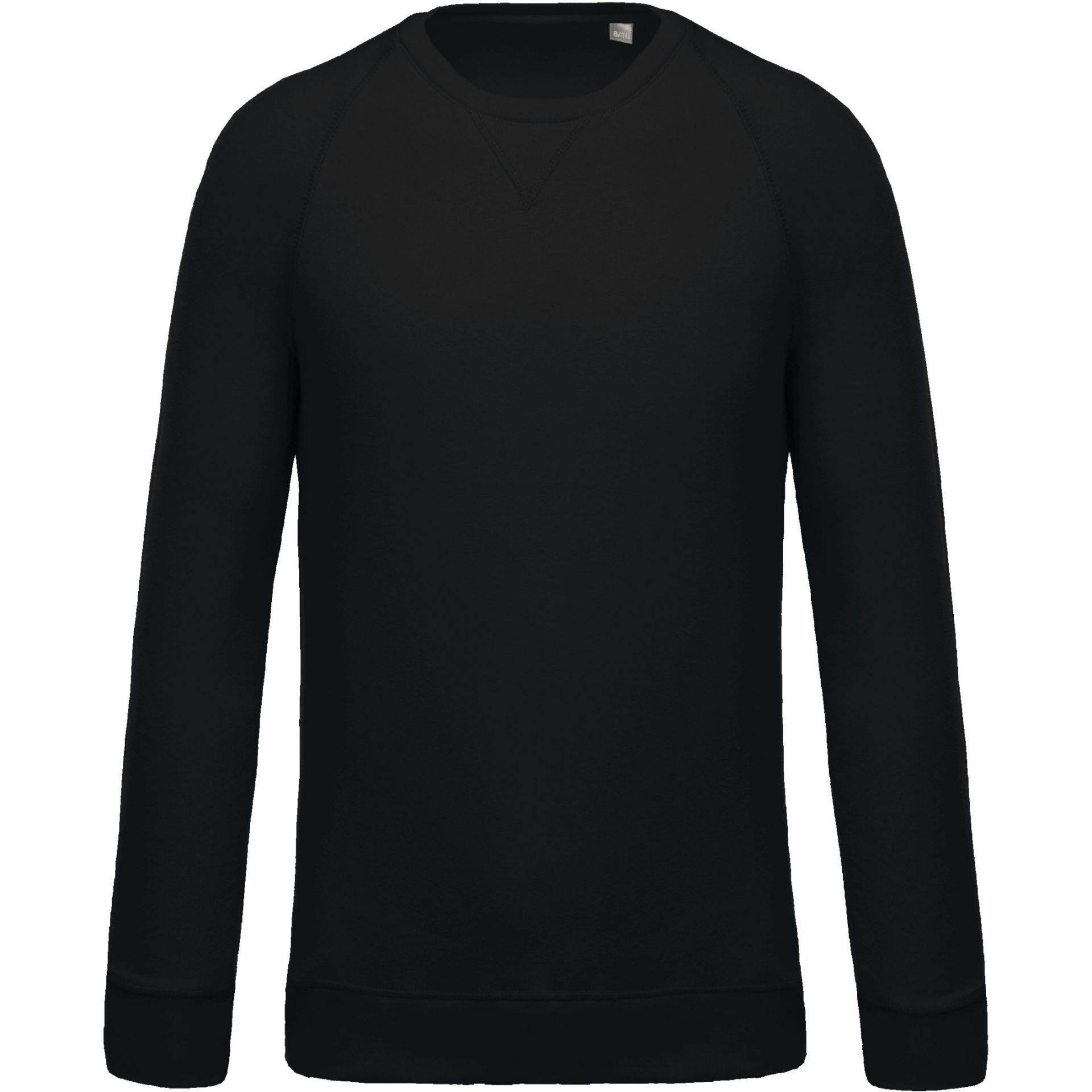 80 % Baumwolle / 20 % Polyester. Aus 80 % biologischer Baumwolle. Ungebürstetes Fleece (French Terry). LST (Low Shrinkage Terry). Strickbündchen an Kragen, Ärmeln und Saum. Nackenband mit Fischgrätmuster und Applikation in V-Form am Ausschnitt. Kein Markenetikett am Kragen, nur Größenkennzeichnung, für eine leichtere Veredelung.