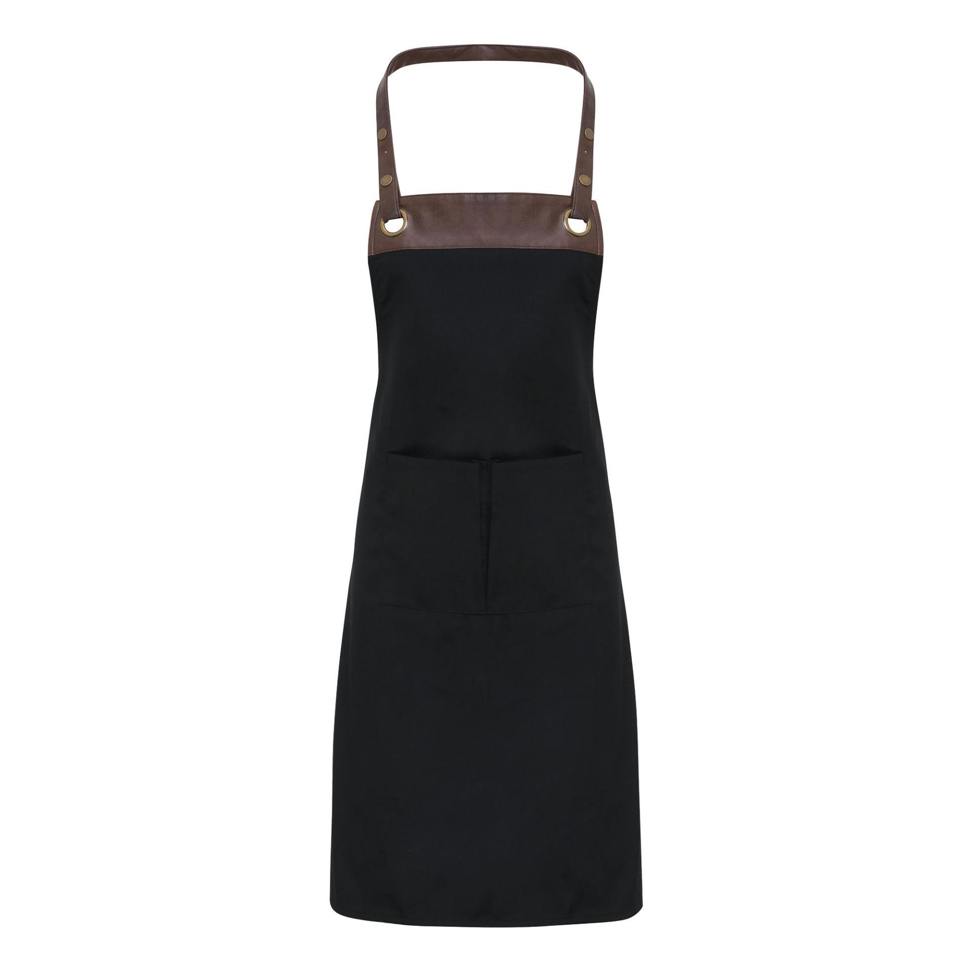 65 % Polyester/35 % Baumwolle. Oberer Teil der Schürze verziert mit einer Kunstlederborte mit 2 großen Ösen, durch die das Nackenband gezogen wird. Das Nackenband ist auf jeder Seite mit zwei Druckknöpfen verstellbar. Mittlere Tasche in der Mitte genäht, um 2 Taschen zu erhalten.