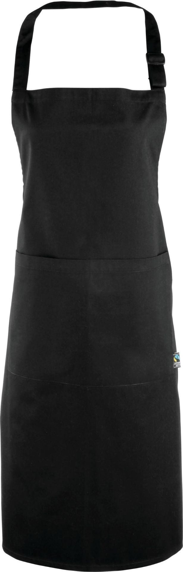 100% Fairtrade Baumwoll-Twill. Nackenband aus gleichem Material mit Größenverstellung. Fronttasche. Schlaufenbänder aus gleichem Material. Breite: 60cm. Länge: 84cm. Hauswäsche bis 40°C
