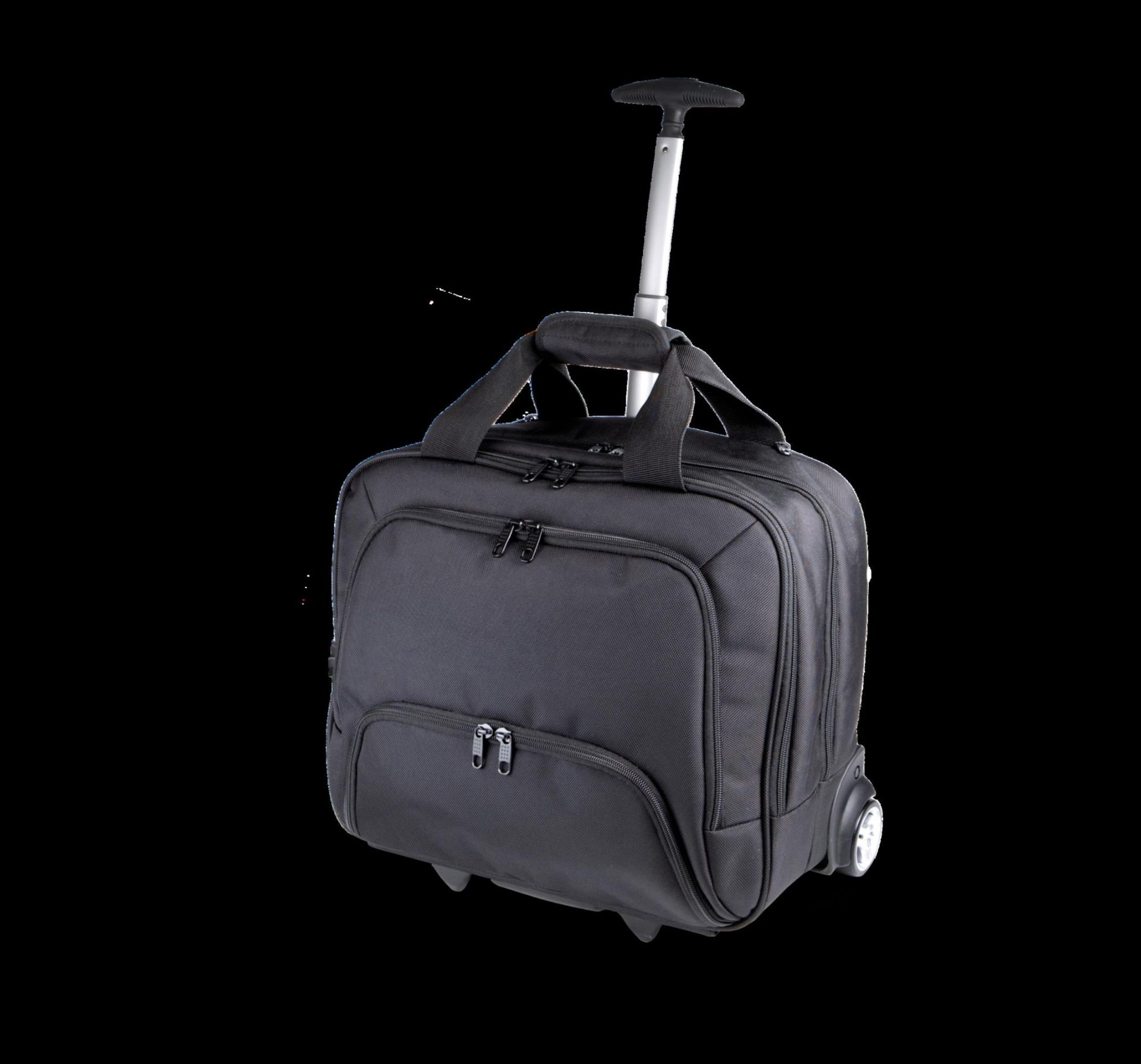 Business Laptop-Koffer. Trolley aus 1680D Polyester, geschwungene Teleskopstange aus galvanisiertem Aluminium, 2 Hauptfächer - eins für Laptops bis 15", das andere für Dokumente und genug Platz für Wechselwäsche, 2 Fronttaschen, Trolley Befestigungssystem rückseitig.