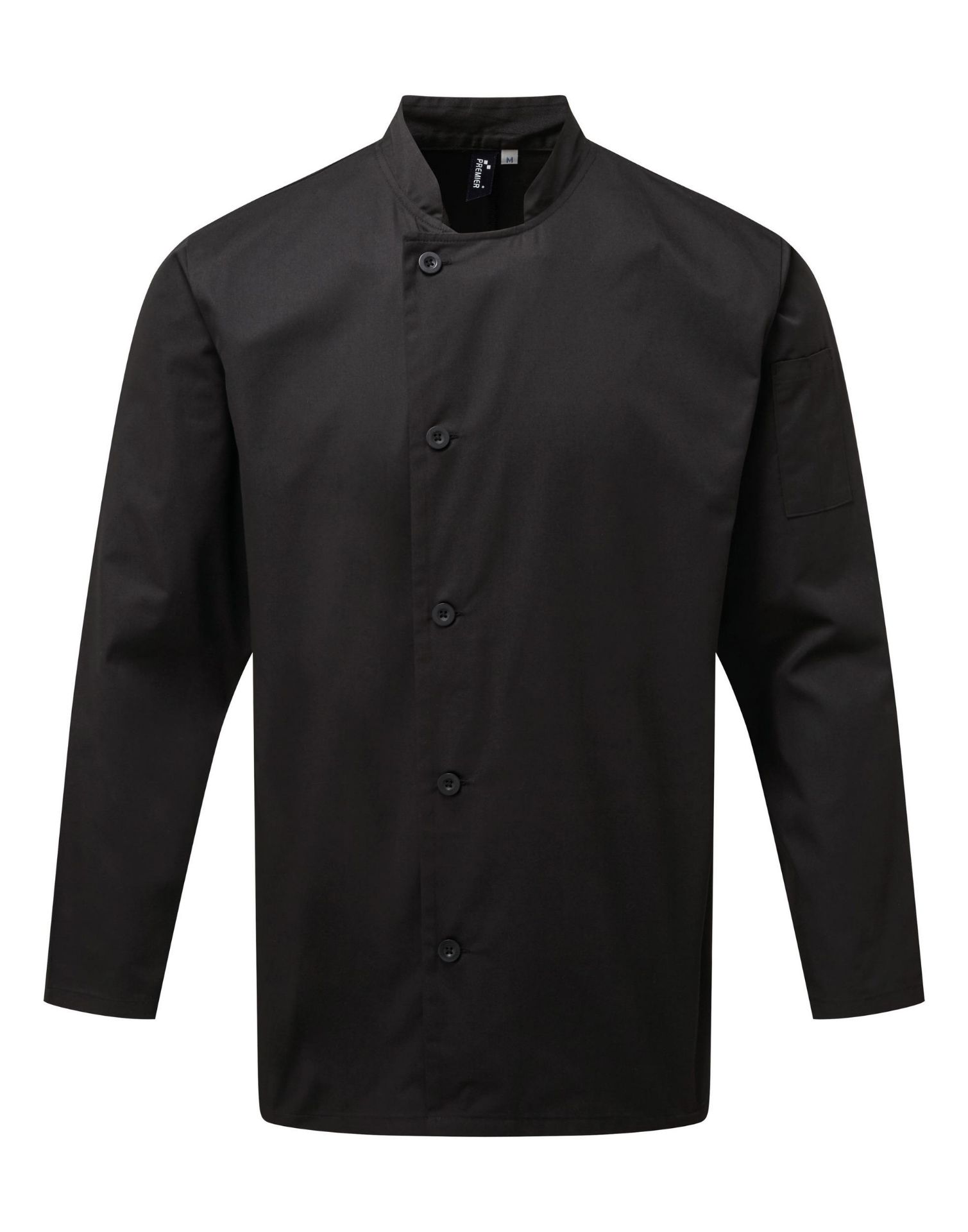 65 % Polyester, 35 % Baumwoll-Serge. Knopfleiste mit fünf hochwertigen Kunstharzknöpfen. Tasche für zwei Stifte am linken Ärmel. Mandarinkragen. Industriewäsche bei 85 °C. Heimwäsche bei 60 °C.