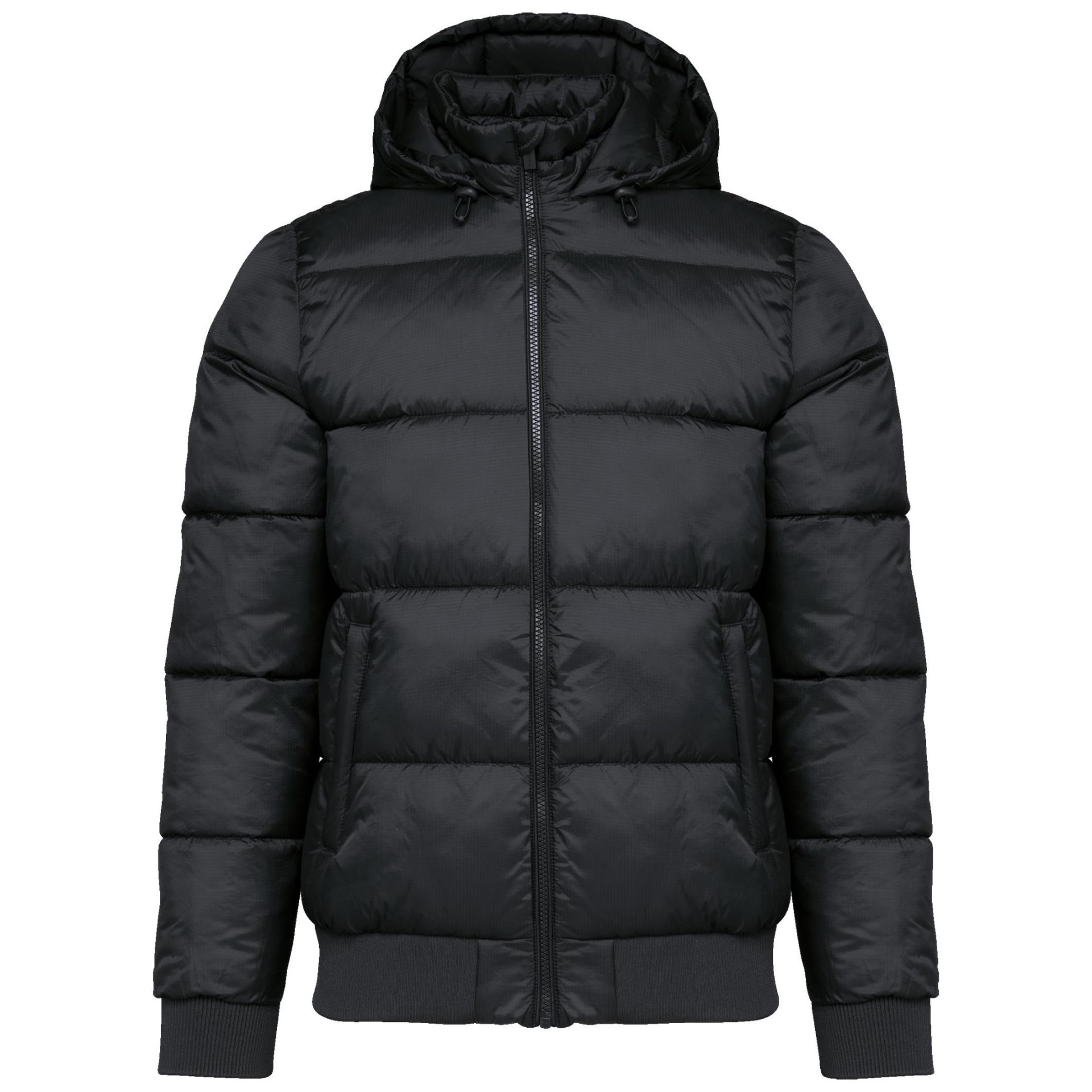 100 % recyceltes Polyamid Ripstop 380T. Wasserabweisendes Material. Besatz innen aus 100 % recyceltem Polyester. Futter aus 100 % recyceltem Polyamid. Gerader Schnitt. 2 Seitentaschen mit Reißverschluss und Paspelierung. 1 aufgesetzte Innentasche mit Klettverschluss. Reißverschluss vorne. Stehkragen mit dreiteiliger, gefütterter, gesteppter Kapuze, die mit einem Stopper verstellt werden kann. Strickbündchen an Ärmeln und Saum. Verdeckter Reißverschluss an der Brusttasche links und am Saum zur Veredelung. Eingespritzte Wattierung: Das Gewicht kann je nach Bereich des Kleidungsstücks variieren. Das Gesamtgewicht dient nur zur Orientierung.