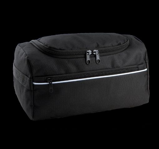 Toiletry bag in 600D polyester. Hookable top flap. Inner pocket. Large front pocket. Side handle.