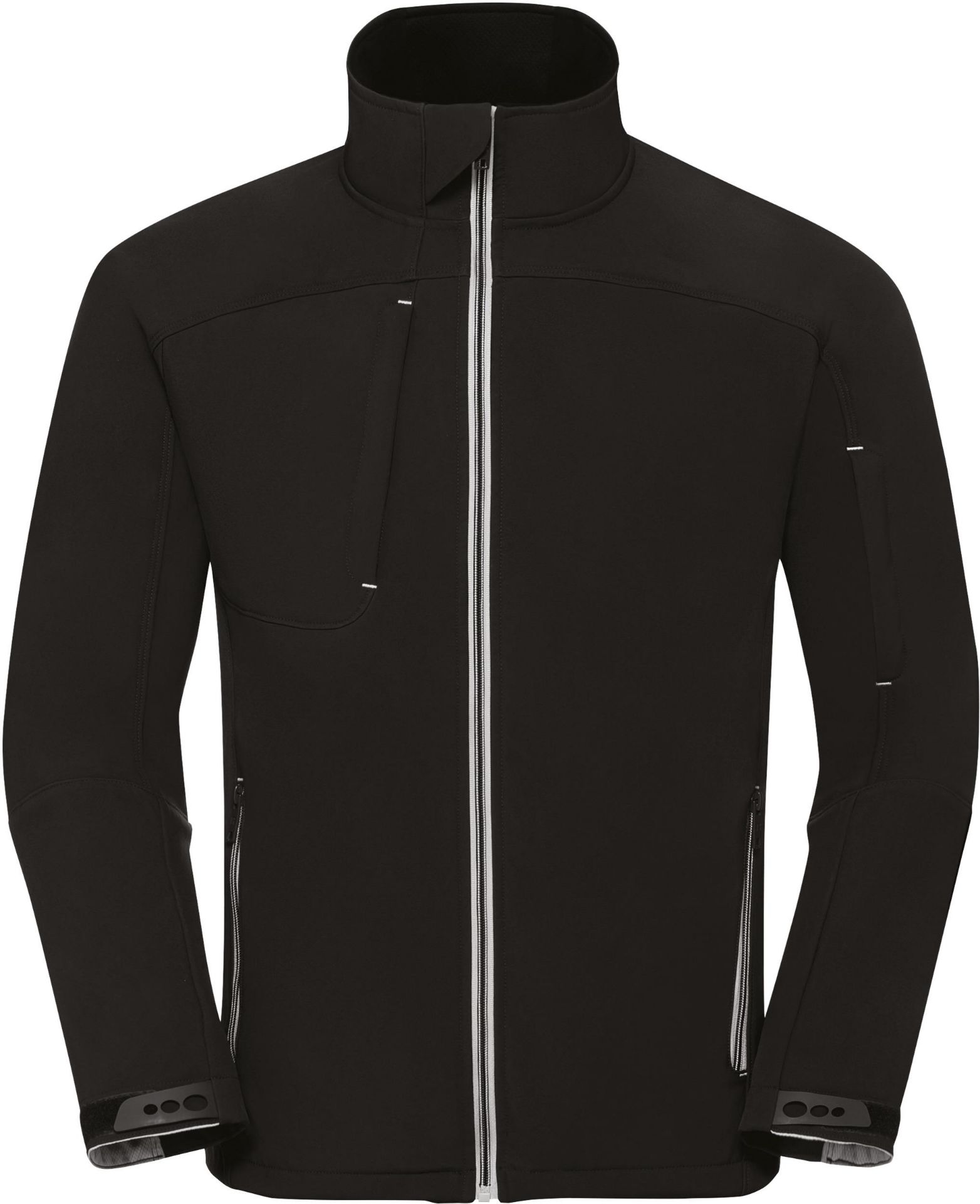 94% polyester/ 6% elastane 3-layer softshell. Treated with Bionic-Finish® Eco. High performance DWR fabric with hydrophobic membrane. Fluorine and PFC free. 5000 mm waterproof. 5000 gsm/24h breathable. Windproof. Contrasting zips and accents. Protecting chin guard. Stand up collar and inner storm flap. Hydroshell air panels at armpits. Inside front honeycomb jersey lining and generous mesh media pocket. Covered zipped pockets: 1 at chest and 1 at sleeve. Adjustable sleeve hems with injected cuff tabs. Seamless shoulder parts. Inside zip for easier personalisation.