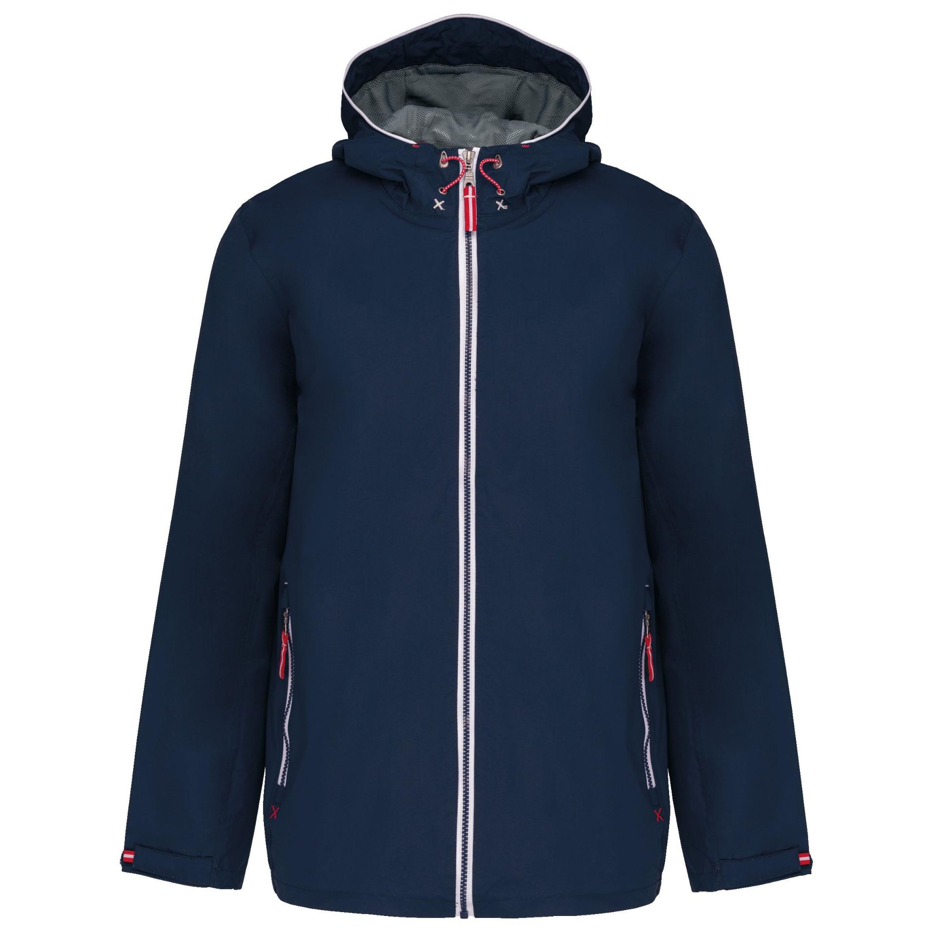 100% polyamide. 5000 gsm/24h breathable and 3000 mm water-resistant. Taped seams. Full front zip. 2 front zipped pockets. 1 inner pocket. Contrast polyester lining. Mesh lined adjustable hood. Zip access for decoration at chest and hem.