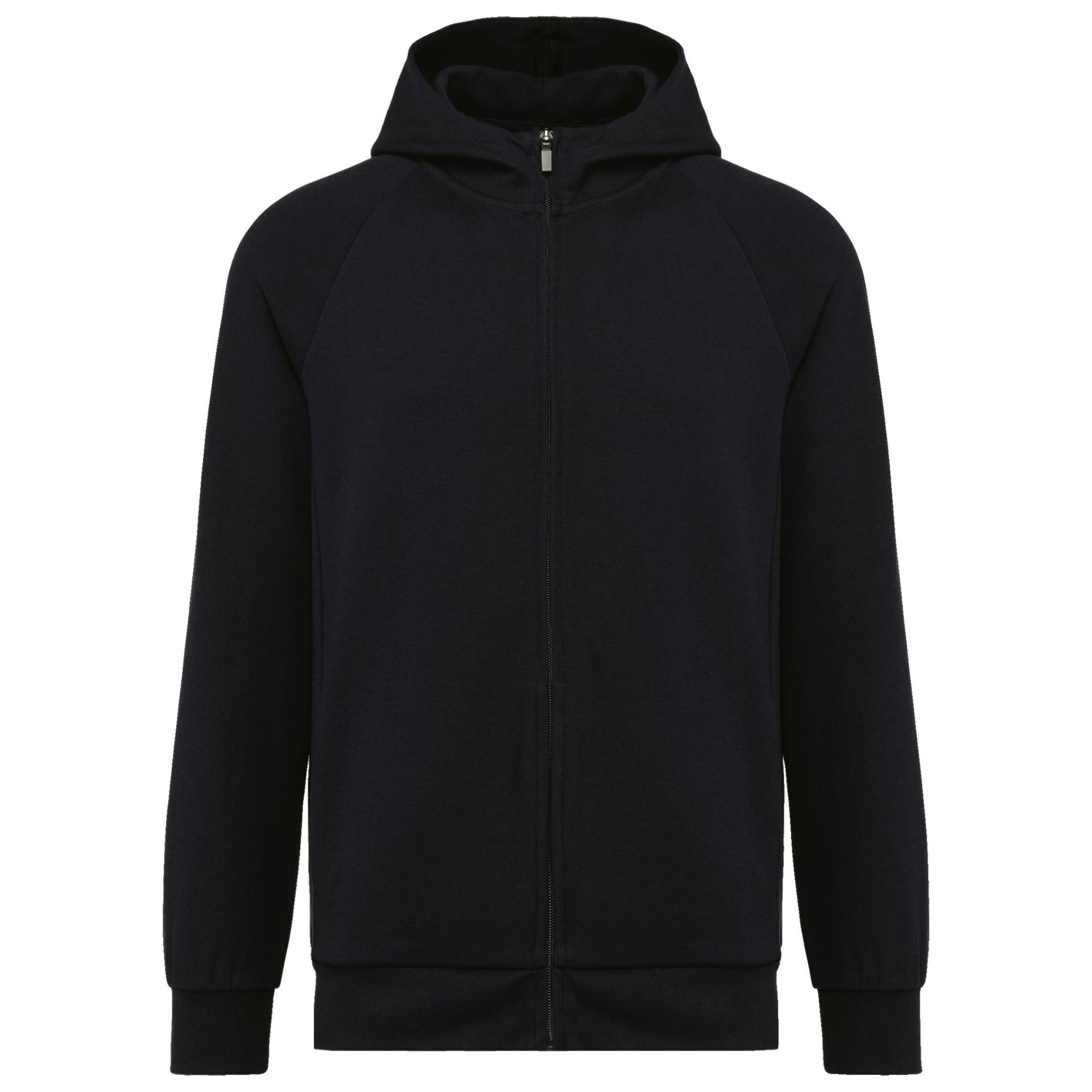 70% cotton / 26% polyester / 4% elastane. Combed cotton. Interlock fabric. LSI treatment (Low Shrinkage Interlock). Two-panel hood, lined in the same fabric as the rest of the jacket, no drawstring. Overstitching at the neck. Taped neck inside the neckline. Matching metal and nylon zip with taped neck inside. Raglan sleeves. 1x1 rib. 2 pockets in the yoke seam. No brand label, only size tag for easy decoration access.