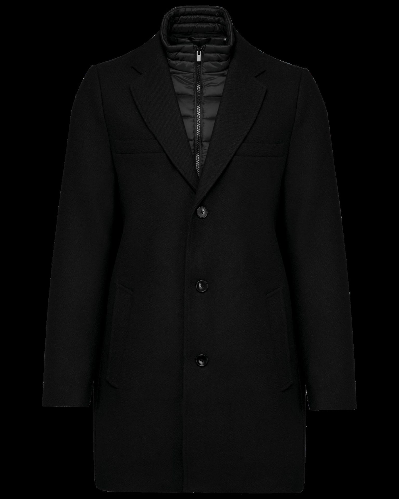 80% polyester et 20% laine. Drap de laine avec construction twill. Coupe droite. Manteau avec une partie amovible en polyamide rembourrée et surpiquée : col et plastron devant détachable par une fermeture intérieure, invisible. Fermeture zippée milieu devant et curseur en métal. Deux poches bas et une poche poitrine passepoilées. Col et manches tailleur. Dessous de col en feutre. Fermeture devant 3 boutons effet corne. Epaulettes. Fente milieu dos. Doublure intérieure en polyester twill. Poches intérieure passepoilées contrastées, deux poches poitrine dont une zippée ainsi qu'une poche téléphone. Bride de suspension intérieure milieu dos.