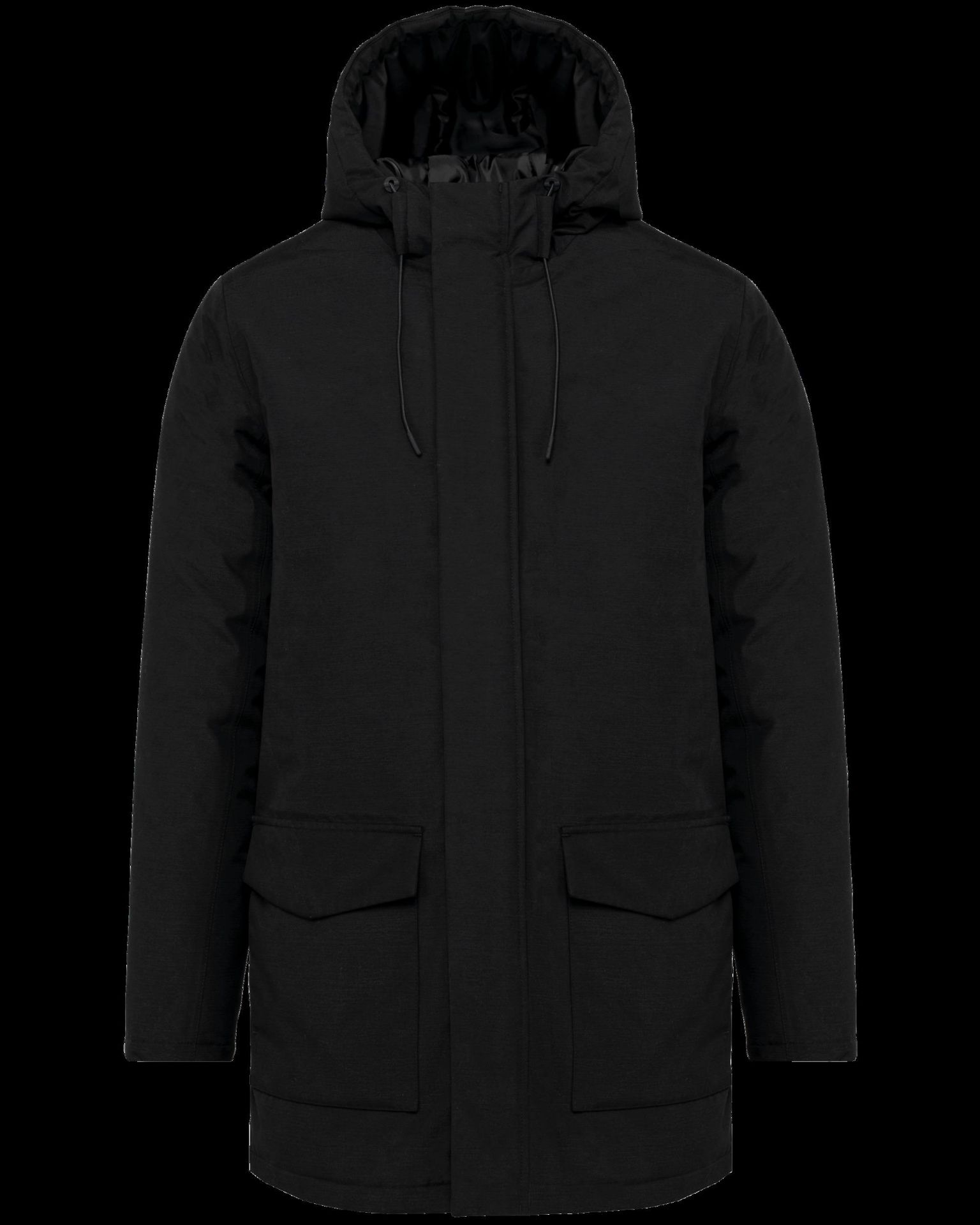 100% polyester ottoman. Doublure 100% polyester taffeta rembourrage en Thinsulate™. Coutures thermosoudées. Ce vêtement imperméable et thermorégulateur permet un bon maintien de la chaleur. Respirant 5000 g/m²/24 h et imperméable 8000 mm. Fermeture zippée avec zip métal noir et rabat à boutons pressions, cache-zipper. Capuche 3 panneaux doublée ajustable avec cordons de serrage et stopper en métal. Deux poches doubles devant une avec rabat et bouton à pression l'autre latérale en double ouverture. 3 poches intérieures dont une poitrine droite fermée avec bouton pression. Fente d'aisance au bas du dos. Zip de personnalisation intérieur bas de vêtement et côté cœur. Patch de personnalisation intérieur dans le haut du dos. Loop intérieur col afin de pouvoir accrocher le vêtement. Pas d'étiquette de marque, uniquement une puce de taille pour faciliter la personnalisation.