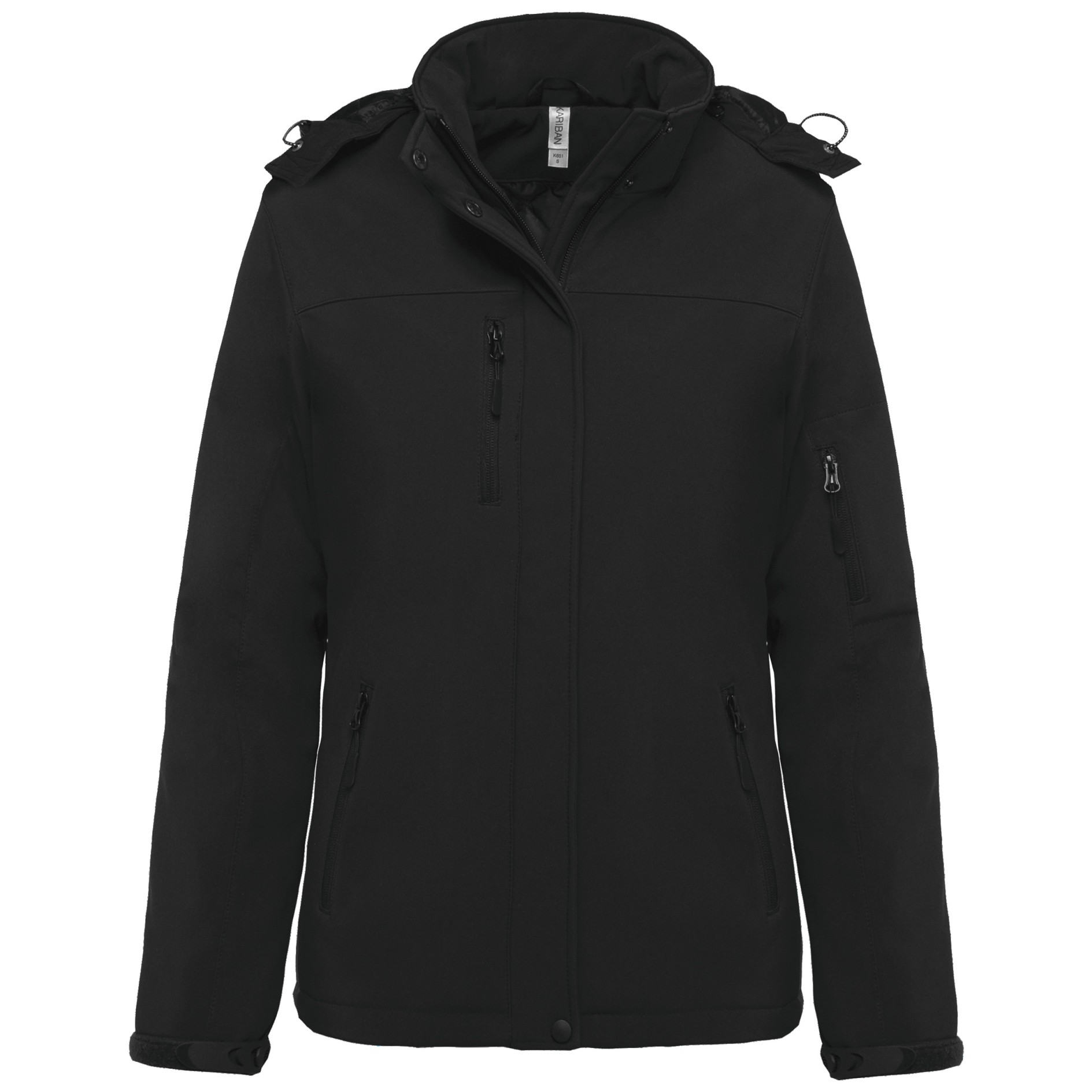 95% polyester / 5% élasthanne. Tissu contrecollé 3 couches respirant 3000 g/m² /24h et imperméable 8000 mm. Extérieur : 95% polyester / 5% élasthanne. Intermédiaire : membrane respirante. Couche intérieure : micropolaire. Doublure matelassée 100% polyester. Devant : 4 poches zippées (2 latérales, 1 sur la manche, 1 poitrine côté droit). 2 poches intérieures avec bouton pression. Capuche amovible 3 panneaux doublée et matelassée, réglable avec stoppeurs. Bas de manche réglable avec bande auto-agrippante. 1 zip côté cœur et 1 zip au bas du vêtement pour accès personnalisation.