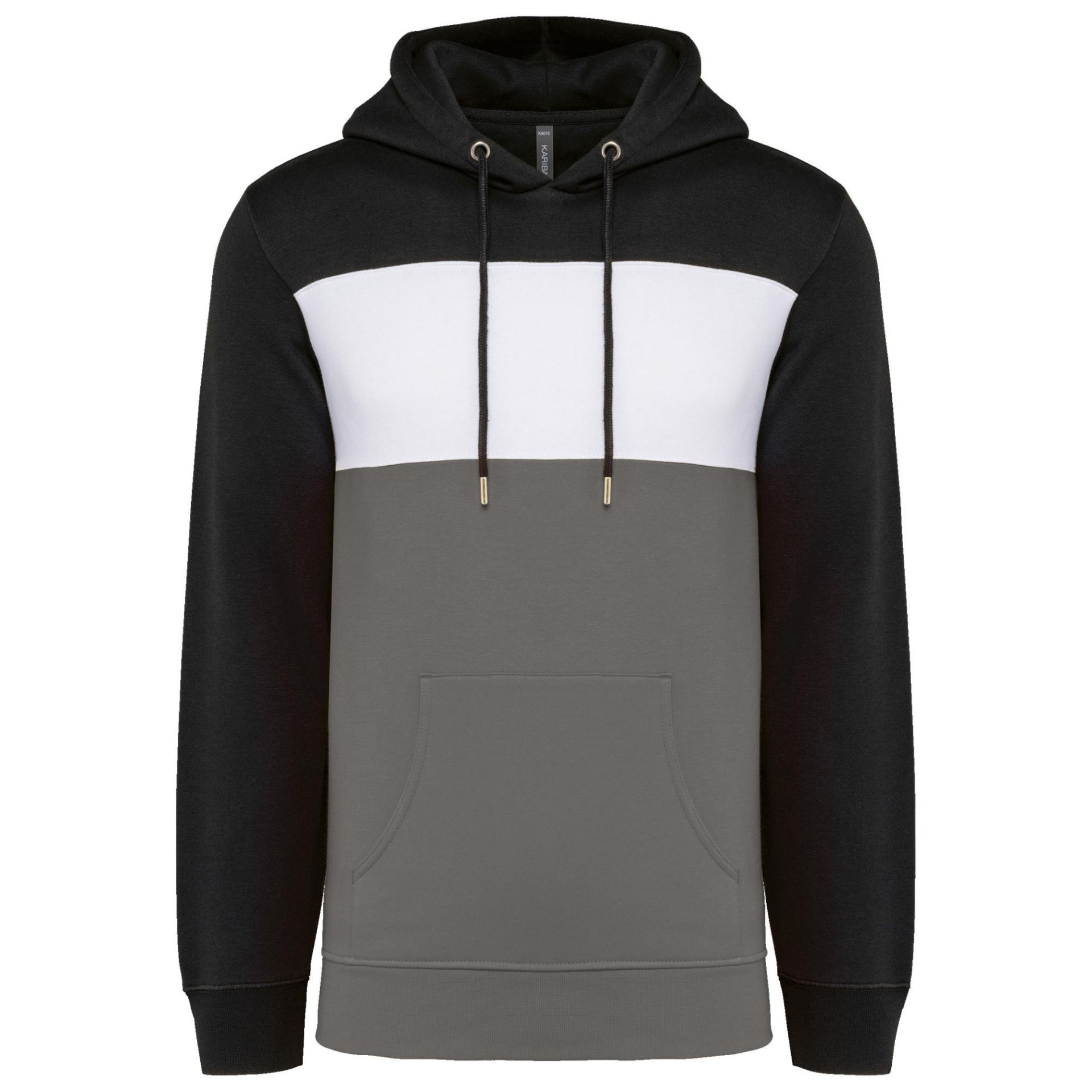 80% coton / 20% polyester. Surface extérieure 100% coton peigné. Molleton gratté 3 fils. LSF (Low shrinkage fleece). Lavage aux enzymes. Coupe ajustée. Sweatshirt capuche tricolore avec bande blanche centrale sur toutes les couleurs. Finition bords côte 1x1 bas de manche et bas de vêtement en tubulaire pour une meilleure finition, avec surpiqûre. Poche kangourou avec double surpiqûre. Capuche à plis avec œillet et embouts cordons en métal, avec cordons de serrage ronds. Bande de propreté en chevrons ton sur ton. Présence d’élasthanne sur bas de manches et de vêtement pour éviter que le vêtement se déforme. Demi-lune au dos pour faciliter la personnalisation. Etiquette de marque au col ainsi qu’une puce de taille déchirables pour faciliter la personnalisation.