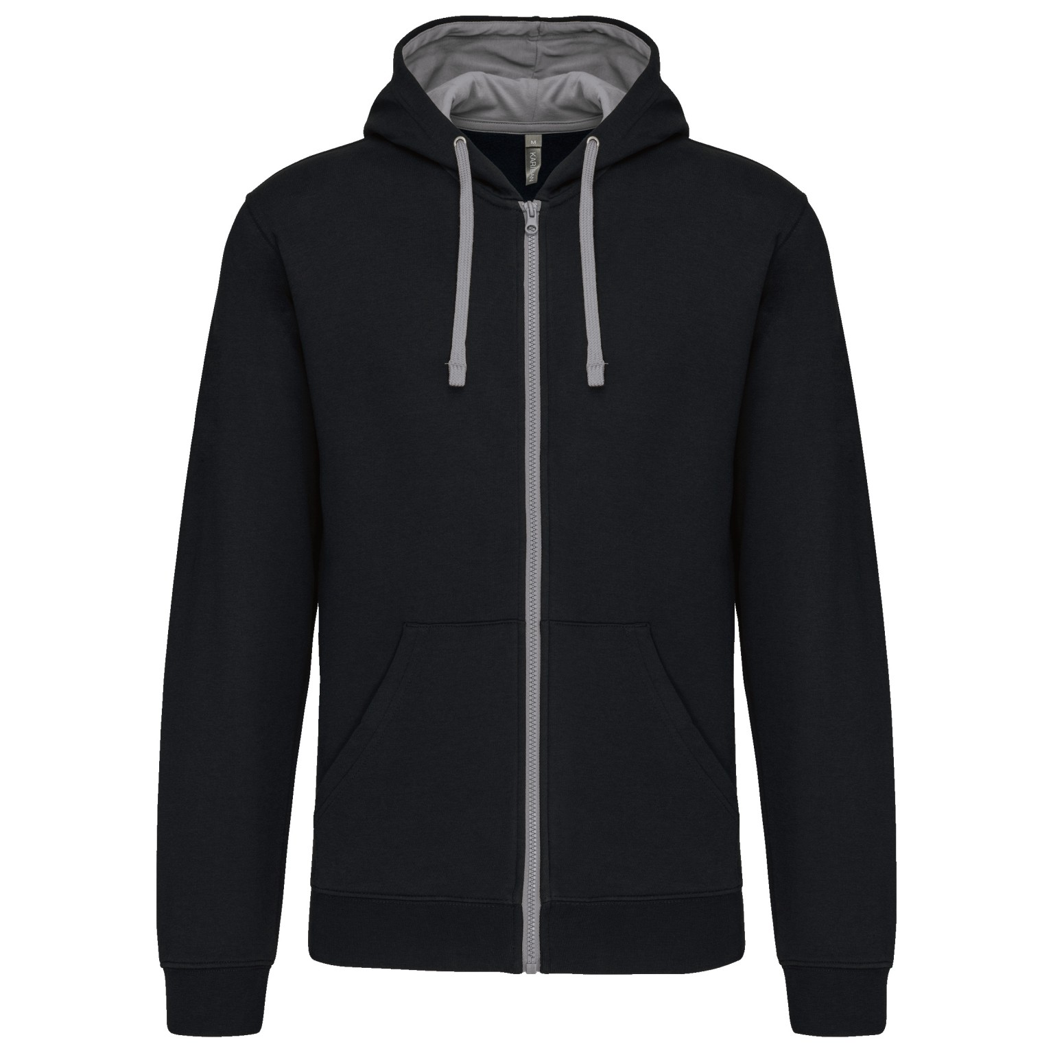 80% coton / 20% polyester. Coton peigné. Molleton gratté. Passe fil écouteurs dans la poche kangourou et encolure. Bord-côte bas de manches et de vêtement. Capuche doublée et contrastée avec cordon de serrage. Zip contrasté.