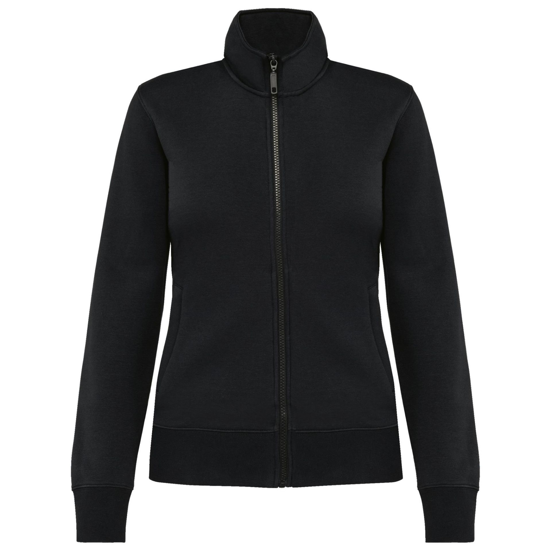 80% coton / 20% polyester. Surface extérieure 100% coton. Traitement LSF (Low Shrinkage Fleece : molleton prérétréci). Molleton gratté 3 fils en coton peigné. Coupe ajustée. Manches droites. Col montant. Fermeture zippée plastique ton sur ton. 2 poches zippées et passepoilées côté. Finition demi-lune à l'encolure dos pour faciliter la personnalisation de marque à l'intérieur col. Finition bord-côte 1x1 bas de manches et de vêtement. Etiquette de marque Tear Away.