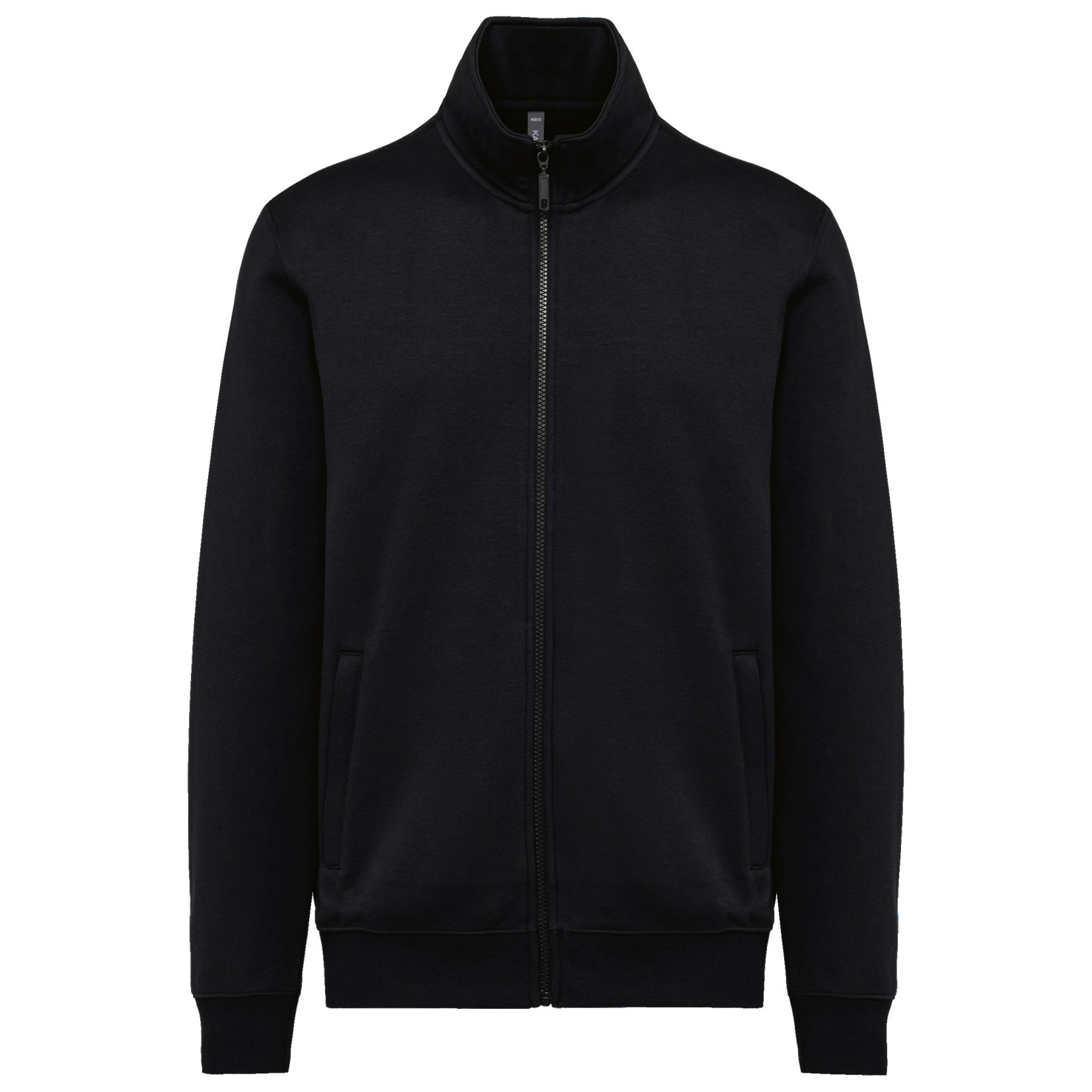 80% coton / 20% polyester. Surface extérieure 100% coton peigné. Traitement LSF (Low Shrinkage Fleece : molleton prérétréci). Molleton gratté 3 fils en coton peigné. Coupe droite. Manches droites. Col montant. Fermeture zippée plastique ton sur ton. 2 poches zippées et passepoilées côté. Finition demi-lune à l'encolure dos pour faciliter la personnalisation de marque à l'intérieur col. Finition bord-côte 1x1 bas de manches et de vêtement. Etiquette de marque Tear Away.
