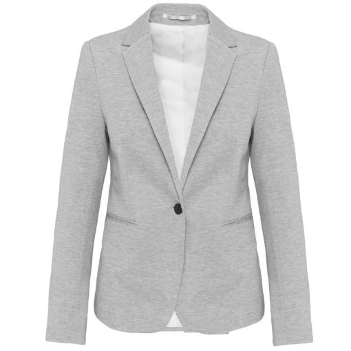 80% polyester / 18% katoen / 2% elasthan (Night navy heather) - 74% polyester / 24% viscose / 2% elasthan (Light grey heather). Interlock. Voering lichaam van polykatoen en mouwen van taffetas polyester. Jas met 1 knoop. 2 omzoomde zakken aan de voorkant. 1 binnenzak met knoop. Contrasterende bies aan de binnenkant vooraan. Mouwuiteinde met 3 knopen, waarvan 1 met contrasterend knoopsgat. 1 ruimtesplit op de achterkant. 1 blinde drukkersrits binnenin aan de voorkant links.